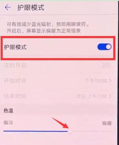 最后点击打开【护眼模式】右侧的开关即可打开护眼模式,还可以打开下面的【定时开启】开关设置定时打开关闭护眼模式,拖动下面色温上的滑块可以对护眼模式下的色温进行调节。