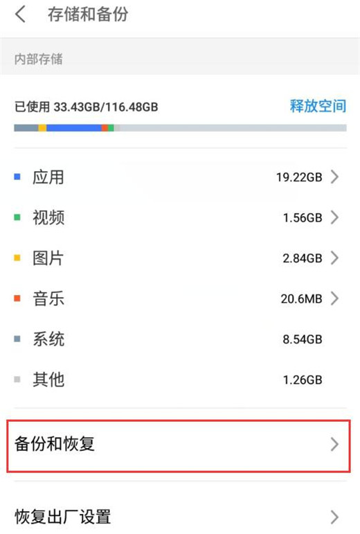 在储存和备份选项中,找到【备份和恢复】选项,打击打开;