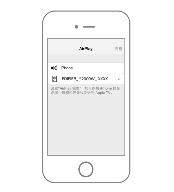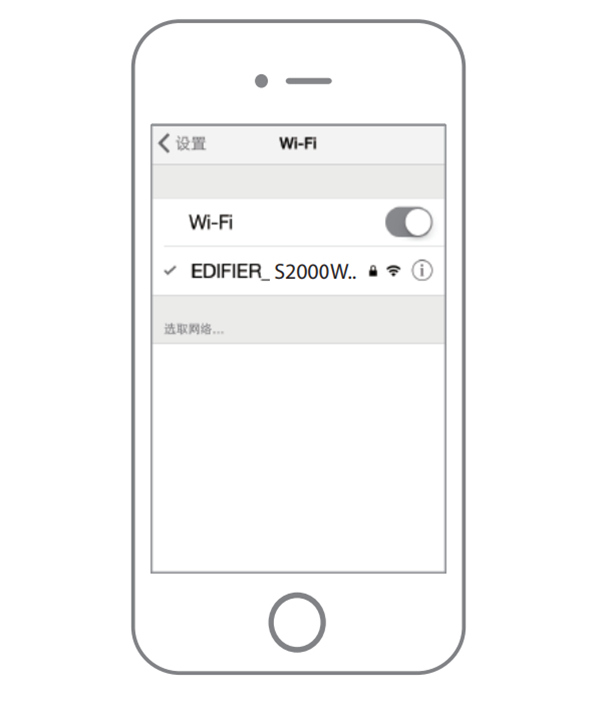 通过手机的WLAN或Wi-Fi设置可以找到EDIFIER_S2000W_xxxx, 并点击连接(默认密码为:12345678)。