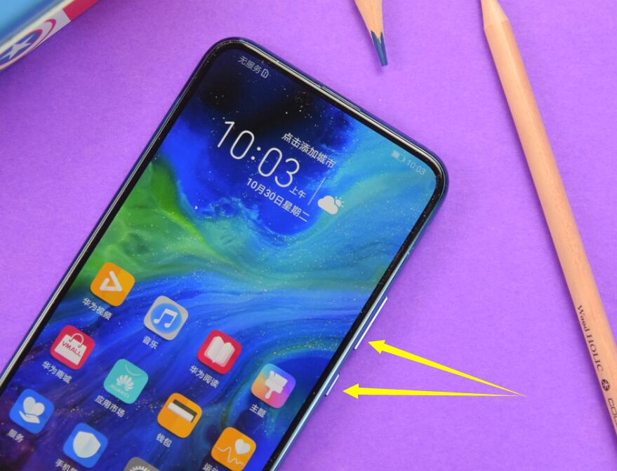 方法一、快捷键截屏。最快捷的截屏方式!同时按下荣耀magic2机身右侧的的电源键和音量下键即可,如下图所示。
