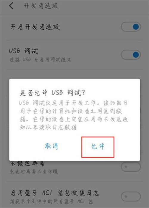 然后把开发者选项打开,找到【usb调试】点击打开,在弹出来的对话框点击允许即可。