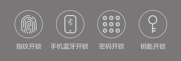 答:指纹开锁、密码开锁、蓝牙开锁(设备共享)、机械钥匙开锁等四种开锁方式。