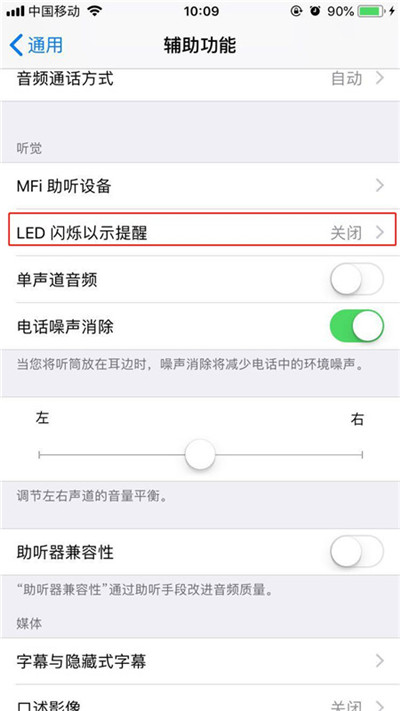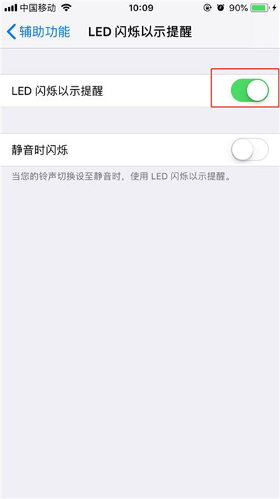 4、往下翻菜单选项,找到【LED闪烁以示提醒】,点击进入并且开启【右侧按钮】,如图所示。