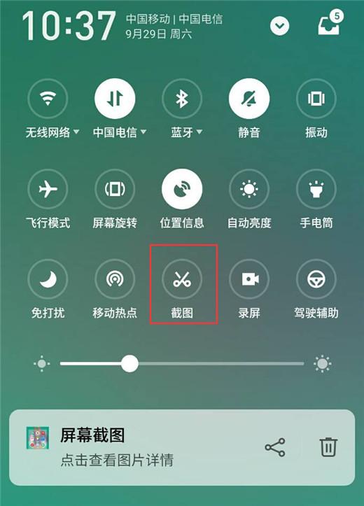 下拉通知栏,找到【截图】功能选项(如下图的位置),屏幕闪的一下即可实现截图。