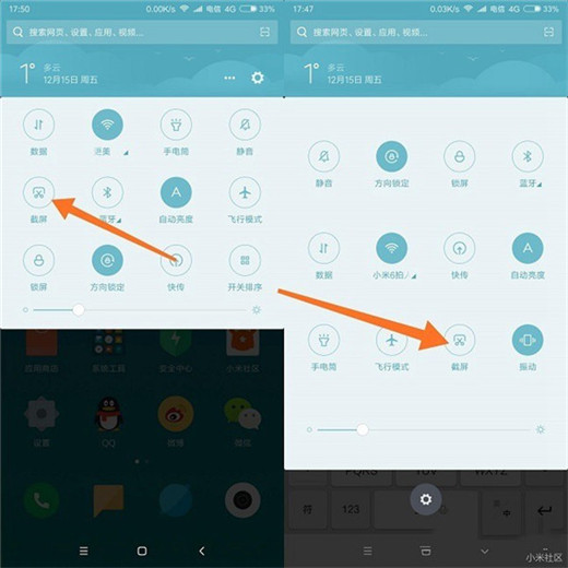 小米MIUI系统简单易用,截图也非常简单,直接在下拉小米8顶部通知栏,找到截屏的按钮,点击即可快速截屏。