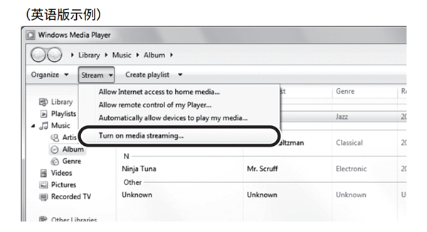 雅马哈NX-N500HIFI有源音响怎么设置音乐文件媒体共享要使用本机播放PC上的音乐文件,您需要在本机和PC之间进行媒体共享设置。这里的示例是在Windows 7 中使用Windows Media Player 进行设置。