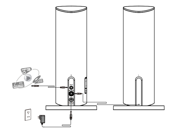 1、我们将电源适配器DC插头的一端接主音箱后面的DC IN输入口,另一端接市电(100V、240V—50Hz/60Hz)插座,主音箱上的LED灯亮,系统进入工作状态。