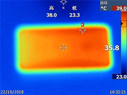 下面我们也进行了实际测试:在手机连接电脑不间断玩游戏大概40分钟后,黑鲨Helo的发热情况整机温度比较均匀,最高温度也只有38℃,可见双热管分区直触式液冷散热的威力,整机发热横均衡。