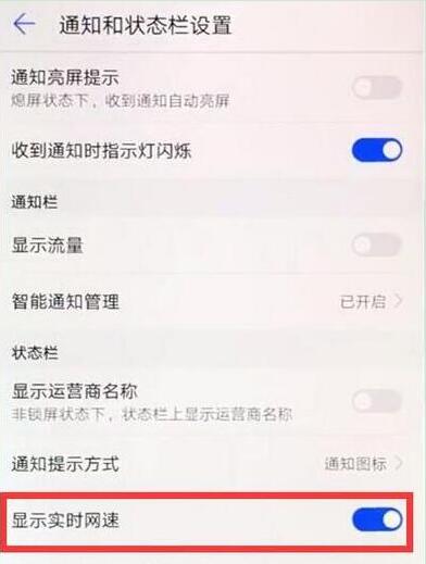 点击打开【显示实时网速】的开关即可在状态栏查看网速。