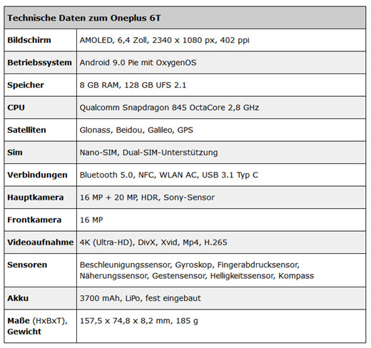 OnePlus 6T拥有8GB RAM,UFS 2.1的128 GB存储。可使用MicroSD卡扩展内存。搭载了骁龙845处理器,后置两个摄像头传感器,带有F / 2.0光圈,一个有1600万像素,而第二个传感器有2000万像素。