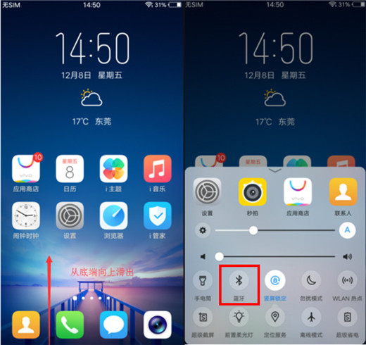 在手机桌面从最底端上滑出快捷栏,下排的就是相当于手机的小工具之类的,找到【蓝牙】这一项打开即可。