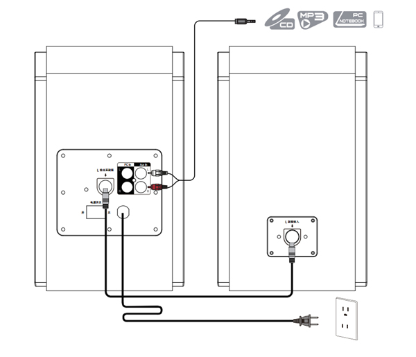 3、将电源线接入市电,打开电源开关,电源指示灯亮,音箱开机。