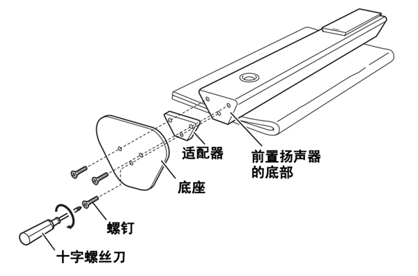 将前置扬声器 (正面朝上)平放在地板上,然后使用提供的螺钉将适配器和底座固定到扬声器上。