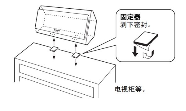 安装固定器前,请先将表面擦拭干净。如果表面肮脏、有油渍或潮湿,粘性会减弱,扬声器可能跌落。
