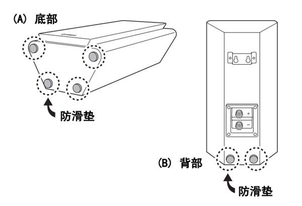 如果在墙面安装,则须将提供的防滑垫固定到扬声器背部,如图所示。