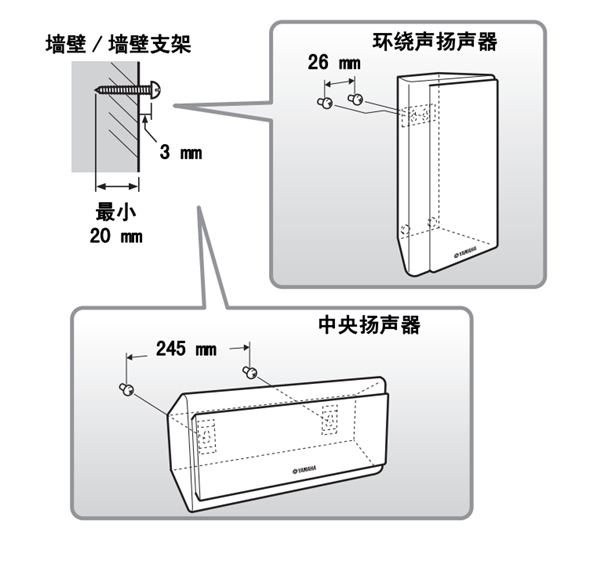 您可以将中央扬声器和环绕声扬声器安装在墙壁上,如下。