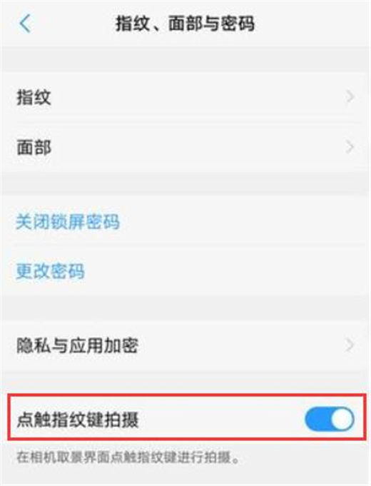 在指纹、面部与密码界面中,找到【点触指纹键拍摄】,打开该选项即可。