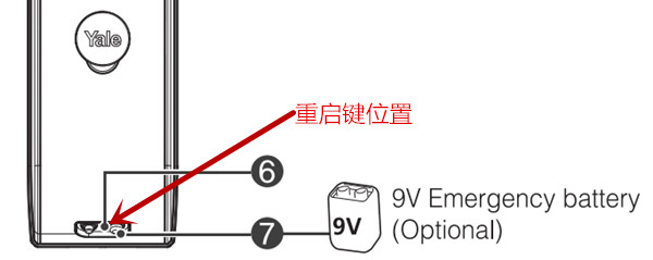 耶鲁指纹锁中还有一种奇怪的复位键位置——️在应急电源的中间位置,而且因为位置太挤,也并没有标出“reset”字样。但是如果您看到指纹锁正中央有个黑色的小孔,然后用卡针插进去还能发现有一些弹性的话那就是这款指纹锁的重启键了。像耶鲁YDM4216指纹锁就是这种设计。