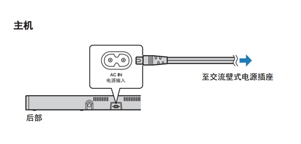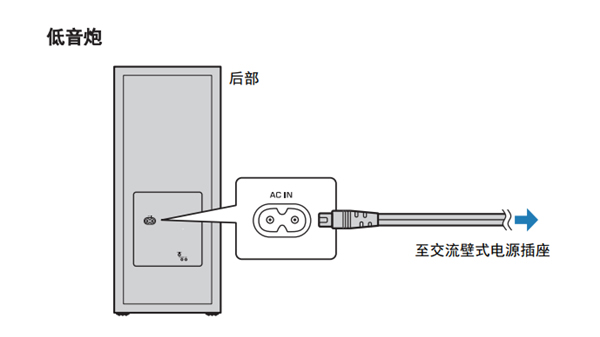 完成所有连接后,将随附的电源线分别连接到主机和低音炮的电源输入(AC IN)插孔,然后再插入交流壁式电源插座。