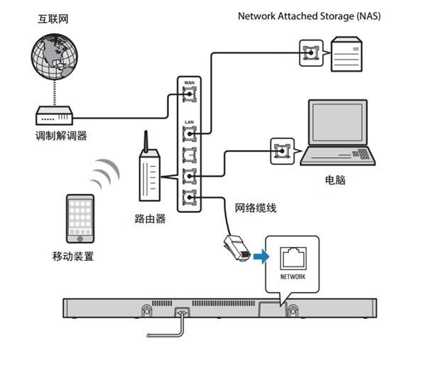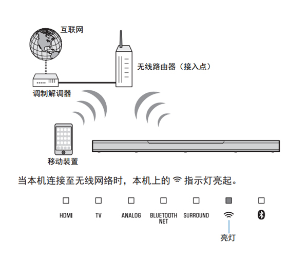 网络连接允许您通过本机收听网络广播电台或音乐流媒体服务,并使用 AirPlay 播放音乐文件夹,或播放存储在您电脑(媒体服务器)上的音乐文件夹。大多数播放需要移动装置的 MusicCast CONTROLLER app。在您的移动装置上安装并使用 MusicCast CONTROLLER app 来播放音乐文件夹。