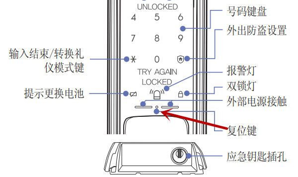首先在指纹锁的门外面板上找到️复位键的位置——在应急电源插口的中间的一个黑色小孔内,因为三星指纹的复位键并不是凸出来的按键,而是处于小孔内,所以需要用卡针或者坚硬细长的棒状物体插入小孔,顶住复位键,一直到指纹锁重新启动为止。如果重启指纹锁系统还是没有用的话那就只能将其初始化或者联系卖家询问对策了。[三星p718指纹锁怎么初始化]