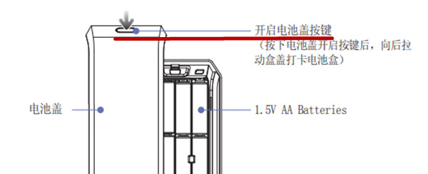走到门内面板,按一下指纹锁️最上方的电池盖开启按键,然后向后拉动盒盖打开电池盒。