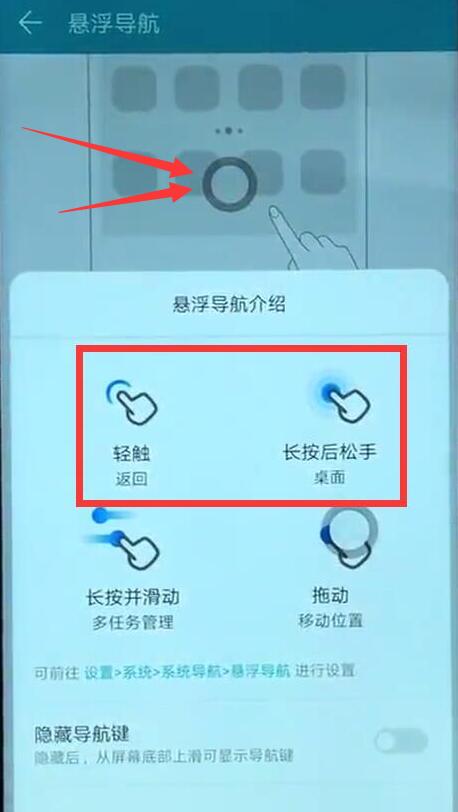 方法二、在使用悬浮导航的情况下,点击悬浮球可返回上一级,长按可返回桌面。