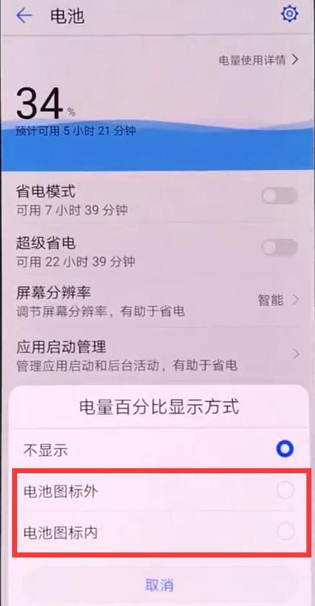 4、点击勾选【电池图标外】即可在电池图标外显示电量百分比,点击勾选【电池图标内】即可在电池图标内显示电量百分比。