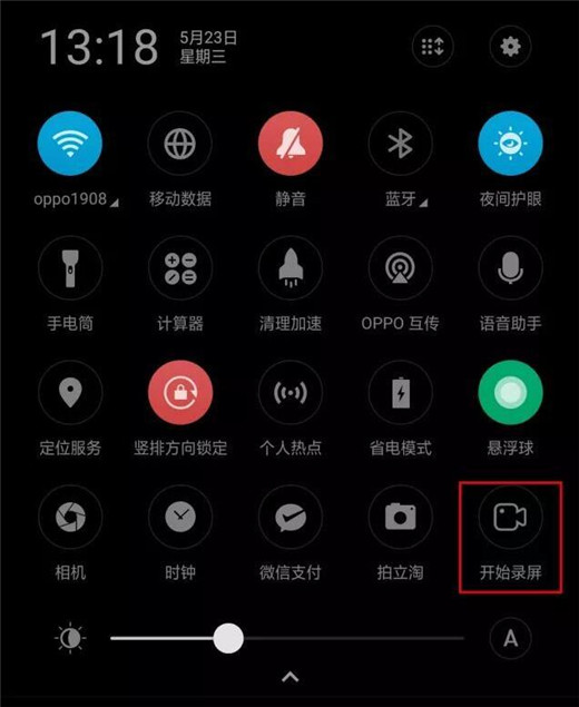 oppoa7x怎么录屏下拉手机屏幕,唤出快捷状态栏,点击上方六个小点的图标显示所有的图标。