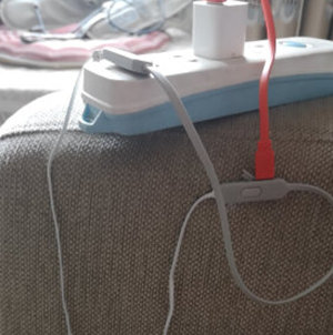 使用充电线比较小的一端接入耳机充电接口,比较大的另一端可以连接到开启电源的 USB 连接口上,也可以连接 USB 充电适配器连接到电源上。