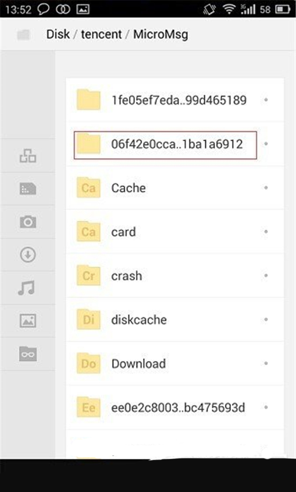 4、点击“MicroMsg”打开,找到如图所示的这个文件夹,也就是名字最长的那一个文件夹,找不到的小伙伴可以把文件夹名字比较长的都打开来看看。