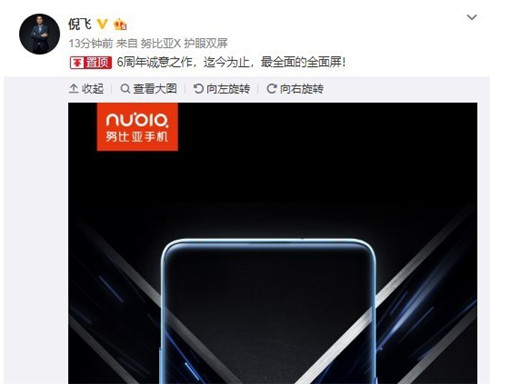 倪飞介绍,努比亚X是努比亚6周年诚意之作,是迄今为止最全面的全面屏产品,根据之前曝光的谍照,努比亚X采用了无刘海设计,背部嵌入了一块副屏。