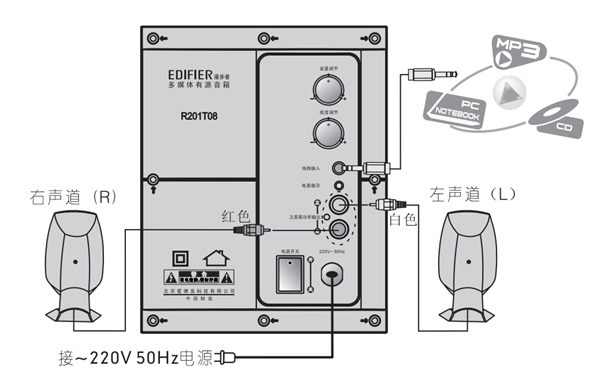 漫步者R201T08多媒体音箱怎么连接安装1、连接左右音箱