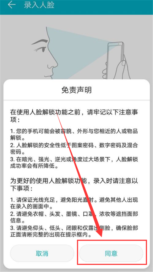 5.在弹出的免责声明”中单击【同意】选项并录入人脸。