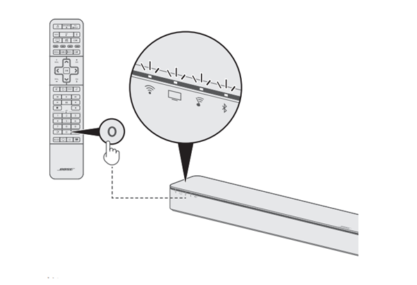 2. 按住O直到条形音箱上的 Wi-Fi 指示灯 、电视指示灯 、SoundTouch® 指示灯 和Bluetooth 指示灯 闪烁白色。