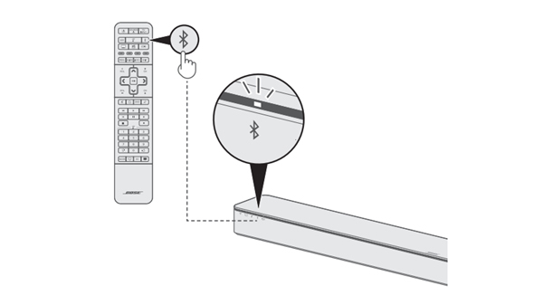 Bose SoundTouch 300 Soundbar无线音箱怎么与蓝牙设备配对与连接1. 在遥控器上,按住Bluetooth 按钮 直到条形音箱上的Bluetooth 指示灯闪烁蓝光。