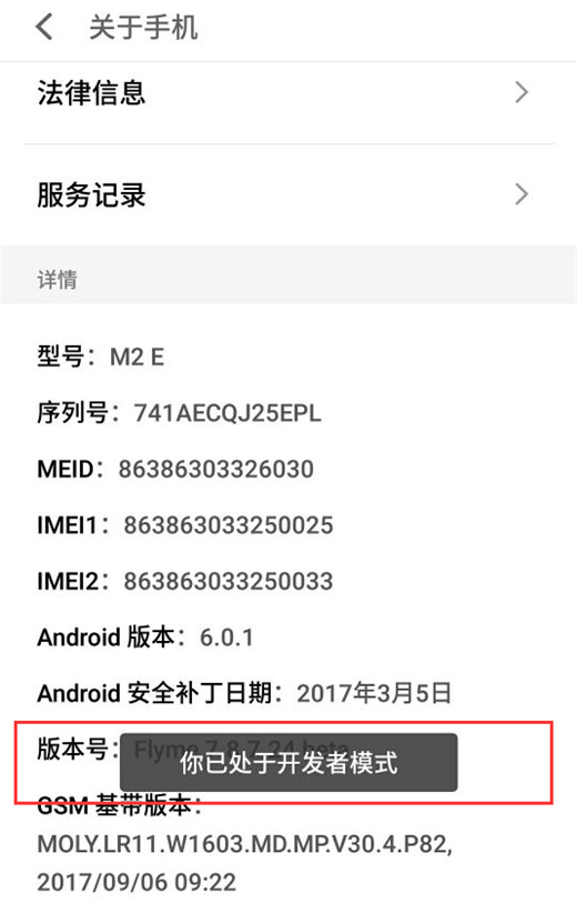 点击最后一项【关于手机】,找到【版本号】连续点击,直到提示’您已处于开发者模式‘即可