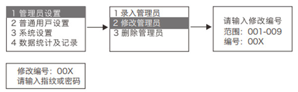 输入您想要修改的管理员密码编号(管理员密码编号范围是001-009),按[↵]键。然后直接就可以输入新的6-10位管理密码了,输入完按[↵]键确认,再重复输入确认一下管理密码就可以了。️操作成功之后原来的管理密码会失效。
