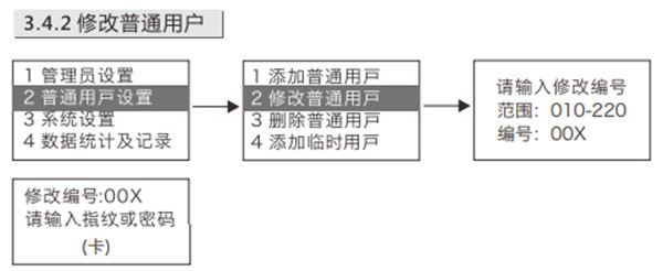 选择“2.普通用户设置”,按[↵]键,然后再选择“2.修改普通用户”,再按[↵]键。[金指码K51指纹锁的键盘怎么操作]
