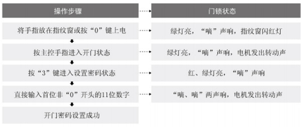 直接输入首位非“0”开头的11位数字。指纹锁发出“嘀、嘀”两声响,说明密码设置成功。(️如果密码首位是0的话那么该密码视为无效密码)