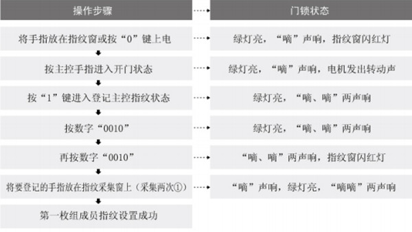 将要登记的手指放在指纹采集窗上(采集两次)(“嘀”声响,绿灯亮, “嘀嘀”两声响),---主控指纹设置成功。