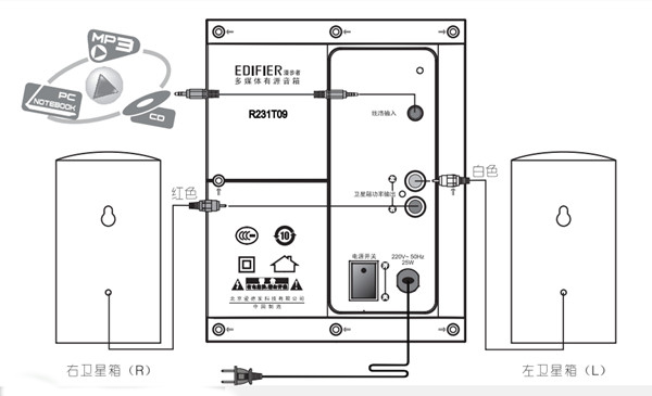 漫步者R231T09怎么安装连线1、连接卫星箱
