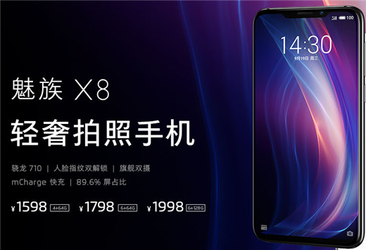 魅族X8搭载骁龙710处理器;为X8的用户准备了4GB/6GBRAM+64GB/128GBRAM三种不同的存储方案。同时魅族X8采用背面指纹识别,0.2s即可解锁/支付。