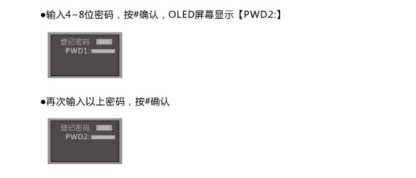 输入️4~ 8位密码,按#确认,OLED屏幕显示[PWD2:],再次输入以上密码,按#确认。