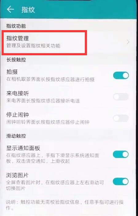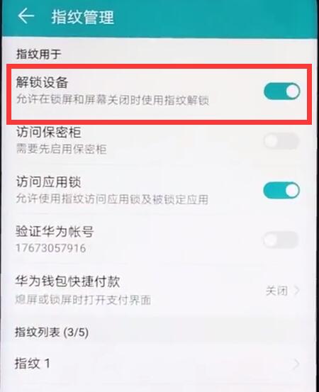 5、最后我们确定一下指纹管理界面的【解锁设备】的开关是打开的,没打开就打开一下,这样就可以用指纹解锁了。