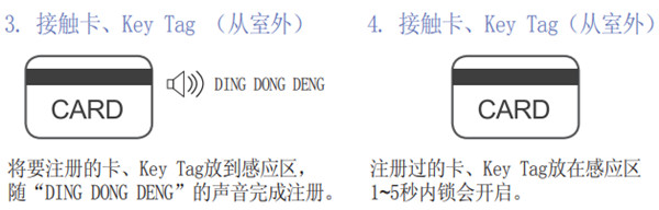 ️将您想要注册的卡放到感应区,系统发出提示音“DING DONG DENG”的声音说明卡片注册完成。如果您还想️继续注册那么在20秒之内继续将卡片放到感应区就行,超过20秒注册卡模式自动关闭。
