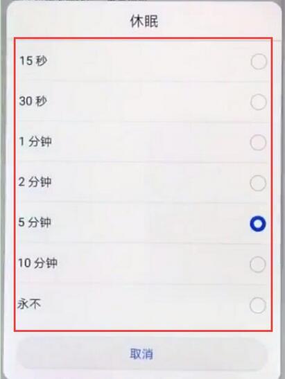 4、然后我们就可以在弹出的选项框中点击勾选合适的休眠熄屏时间,点击勾选【永不】的话,手机打开锁屏后即使无操作也会屏幕常亮。