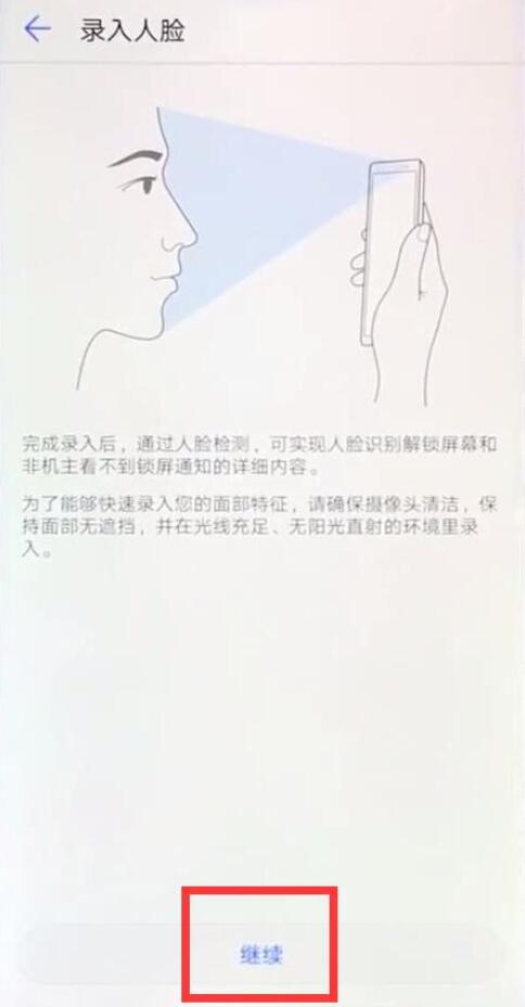 4、然后我们会进入如下页面,点击屏幕下方的【继续】进行录入人脸,手机正对着脸按提示完成录入,一定要确保光线充足,环境里没其他人入镜!录入后即可设置人脸解锁。
