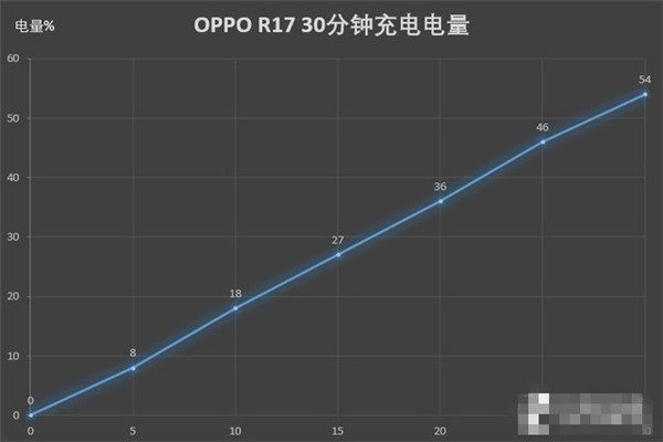 从上图的曲线我们可以看出,OPPO R17在前30分钟内充电速度都保持在一个很不错的水平,平均每分钟可以充1.8%的电量,可以确保在平时碎片化的充电时间内有效的充电。