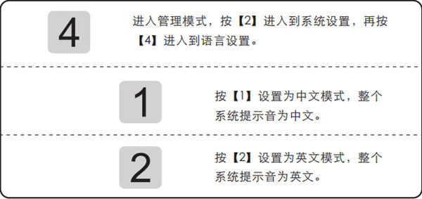 ️按数字键[1]将整个系统提示音语言设置为️中文。️按数字键[2]则将提示音设置为️英文。